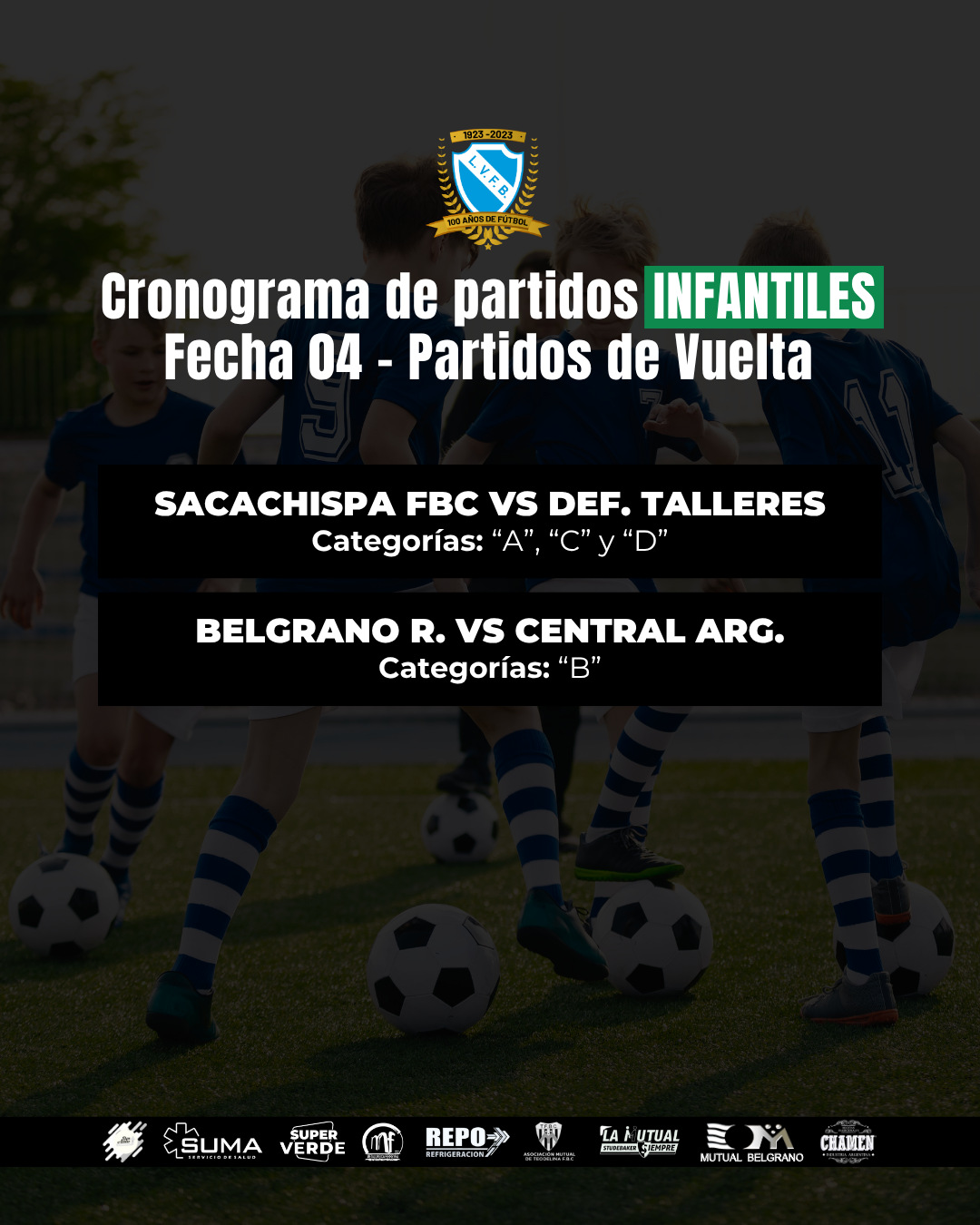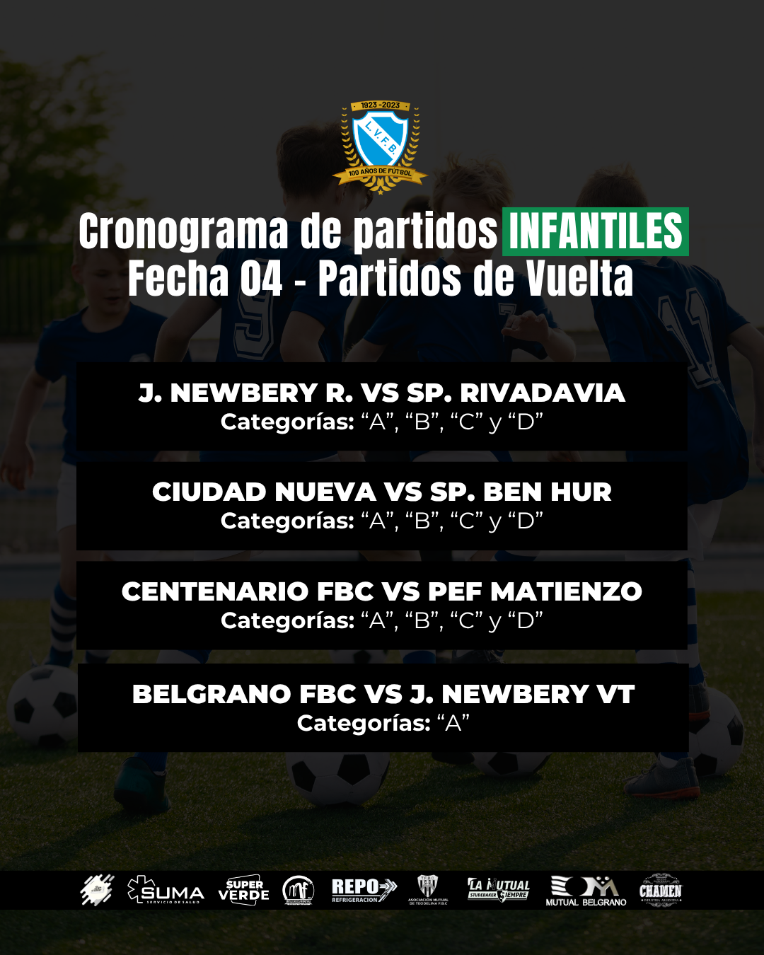 Infantiles 2025: Cronograma de partidos Fecha 04 (Vuelta) Compartimos el cronograma de partidos de la Fecha 04 (Vuelta) y adelantado del Torneo de Infantiles de la #LigaVenadense que se jugará el Viernes 10 de Octubre.