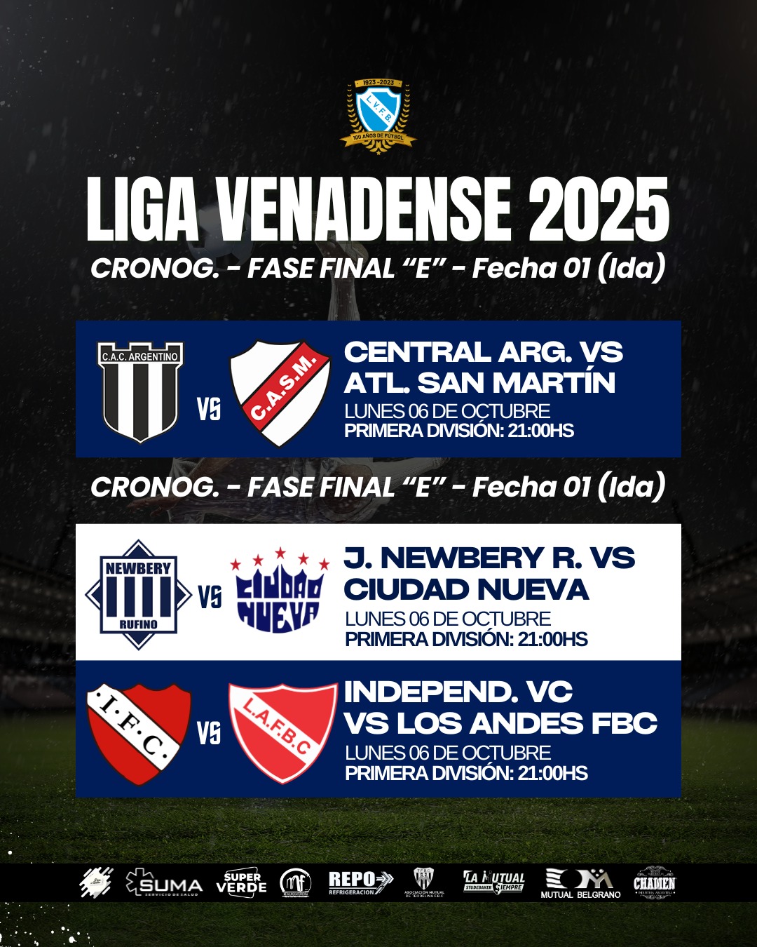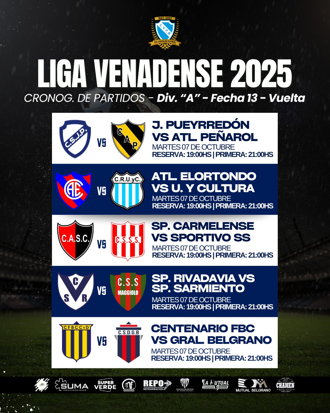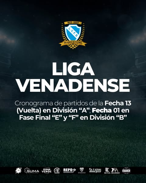 Compartimos el cronograma de partidos correspondiente a la Fecha 13 (Vuelta) en División “A” y Fecha 01 de la Fase Final "E" y "F" en División "B" de la #LigaVenadense