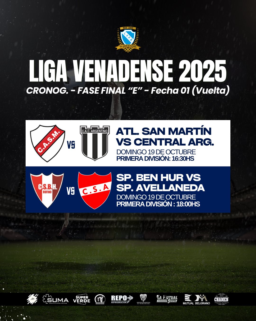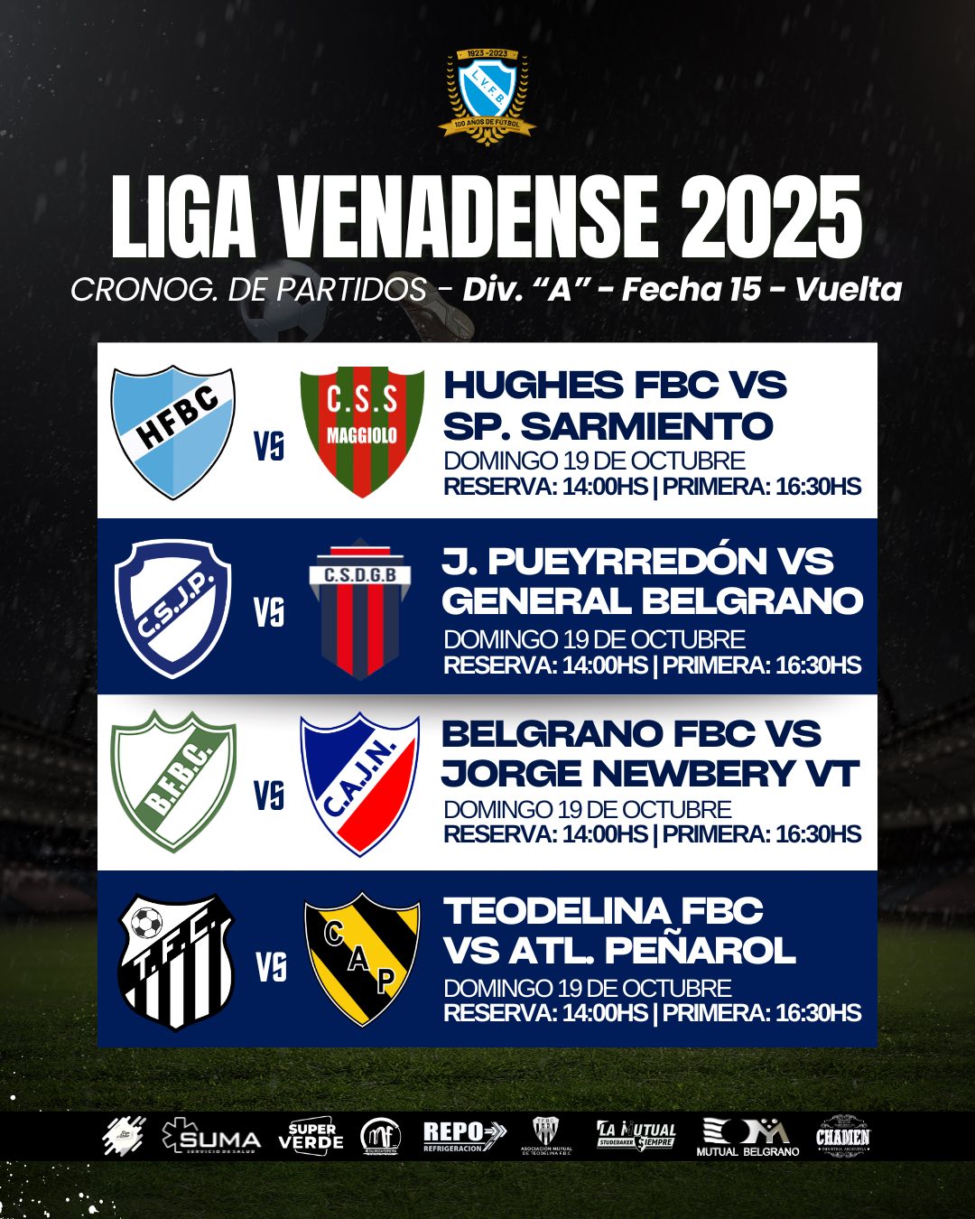 Compartimos el cronograma de partidos correspondiente a la Fecha 15 (Vuelta) en División “A” y Fecha 01 (Vuelta) en Fase Final “E” y “F” en División “B” de la #LigaVenadense