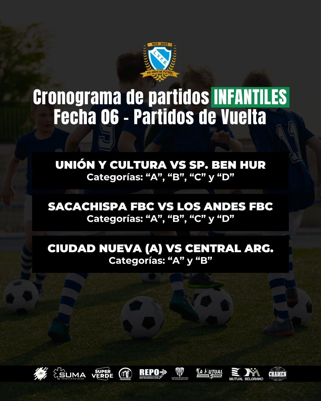 Infantiles 2025: Cronograma de partidos Fecha 06 (Vuelta) Compartimos el cronograma de partidos de la Fecha 06 (Vuelta) del Torneo de Infantiles de la #LigaVenadense