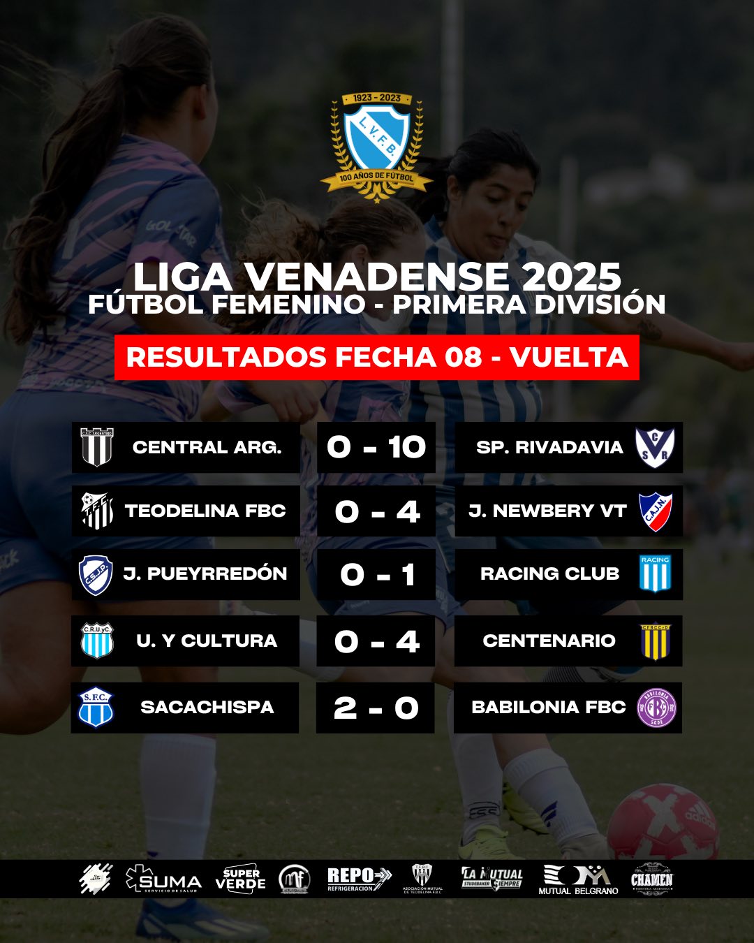 Femenino Primera 2025: Resultados de la Fecha 08 - Clausura Compartimos los resultados de la Fecha 08 (Vuelta) del Torneo de Fútbol Femenino en Primera División de la #LigaVenadense