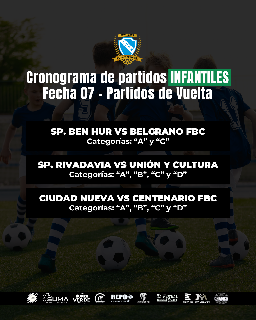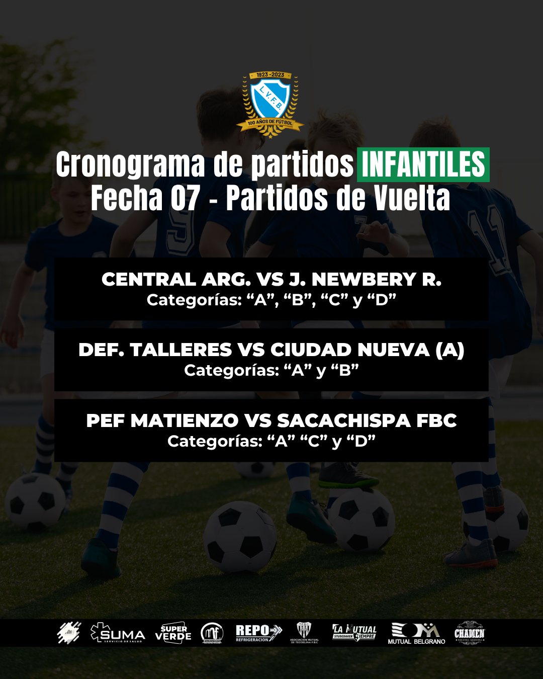 Infantiles 2025: Cronograma de la Fecha 07 (Vuelta) Compartimos el cronograma de partidos de la Fecha 07 (Vuelta) del Torneo de Infantiles de la #LigaVenadense