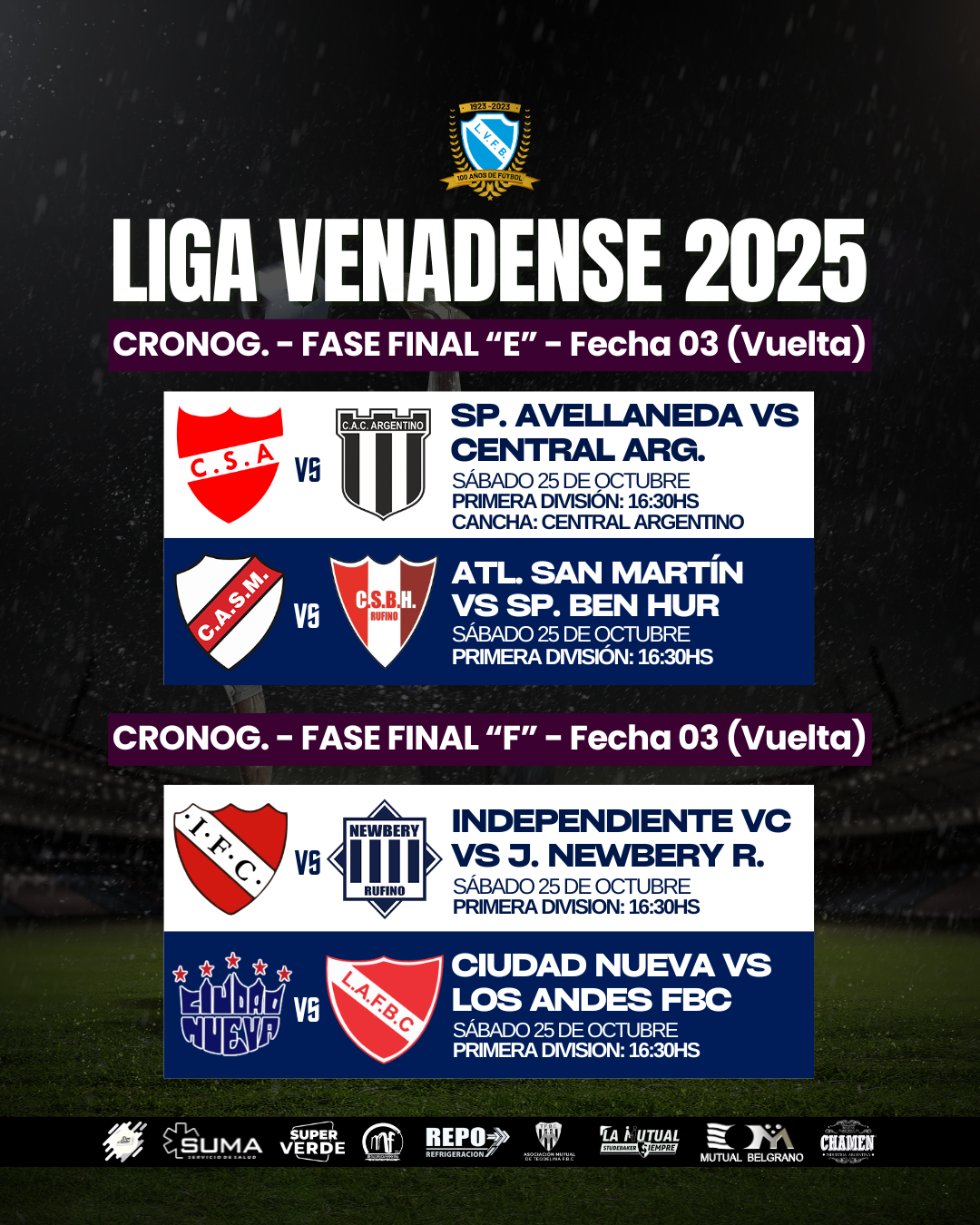 Compartimos el cronograma de partidos correspondiente a la Fecha 03 (Vuelta) en División “B”, Fase Final “E” y “F” de la #LigaVenadense