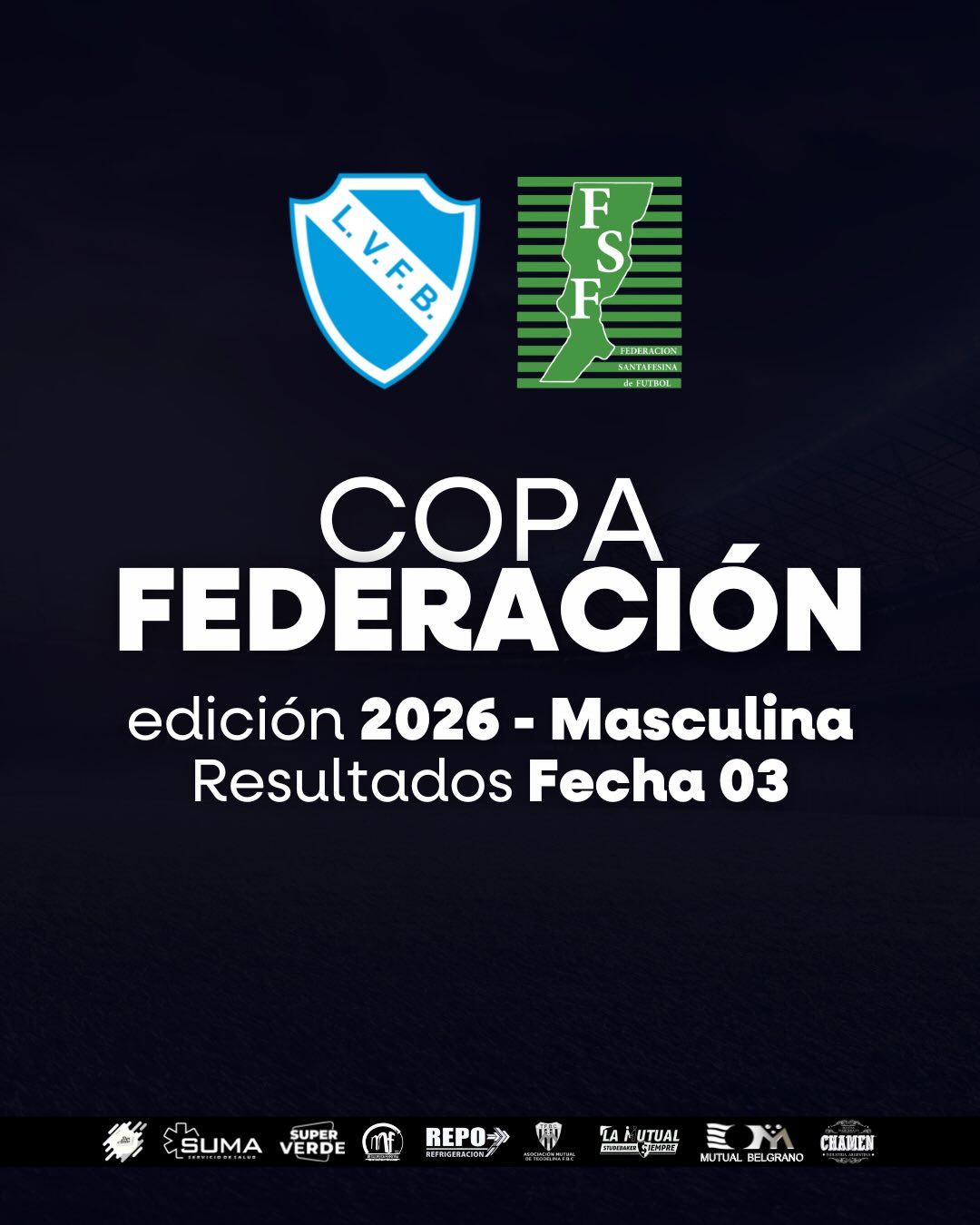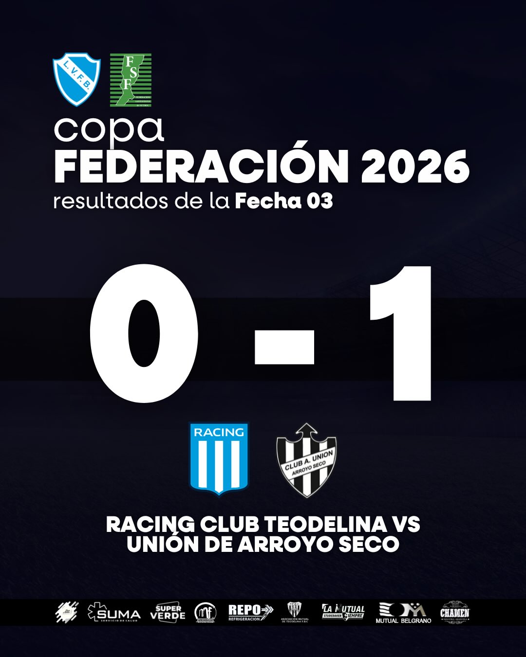 Artículos Copa Federación Masculina: Resultados de la Fecha 03 Escrito por Liga Venadense de Foot Ball 10 Febrero 2026 NOTICIAS DESTACADAS Por favor, vote Voto 1 Voto 2 Voto 3 Voto 4 Voto 5 Compartimos los resultados de la Fecha 03 de la Copa Federación Masculina en la que participan los equipos de la #LigaVenadense Desde la #LigaVenadense felicitamos a @racingclubteodelinaoficial por haber clasificado a la próxima instancia. Anterior Siguiente