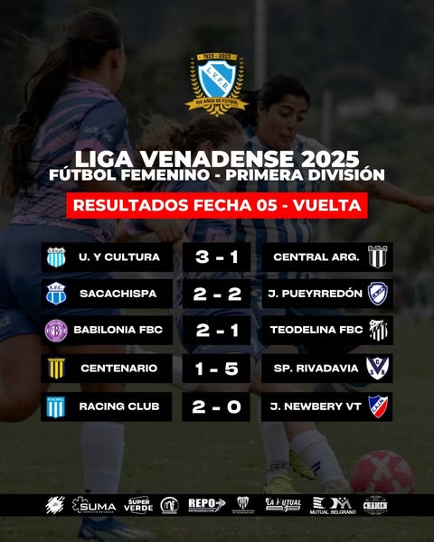 Compartimos los resultados de la Fecha 05 (Vuelta) del Torneo de Fútbol Femenino en Primera División de la #LigaVenadense
