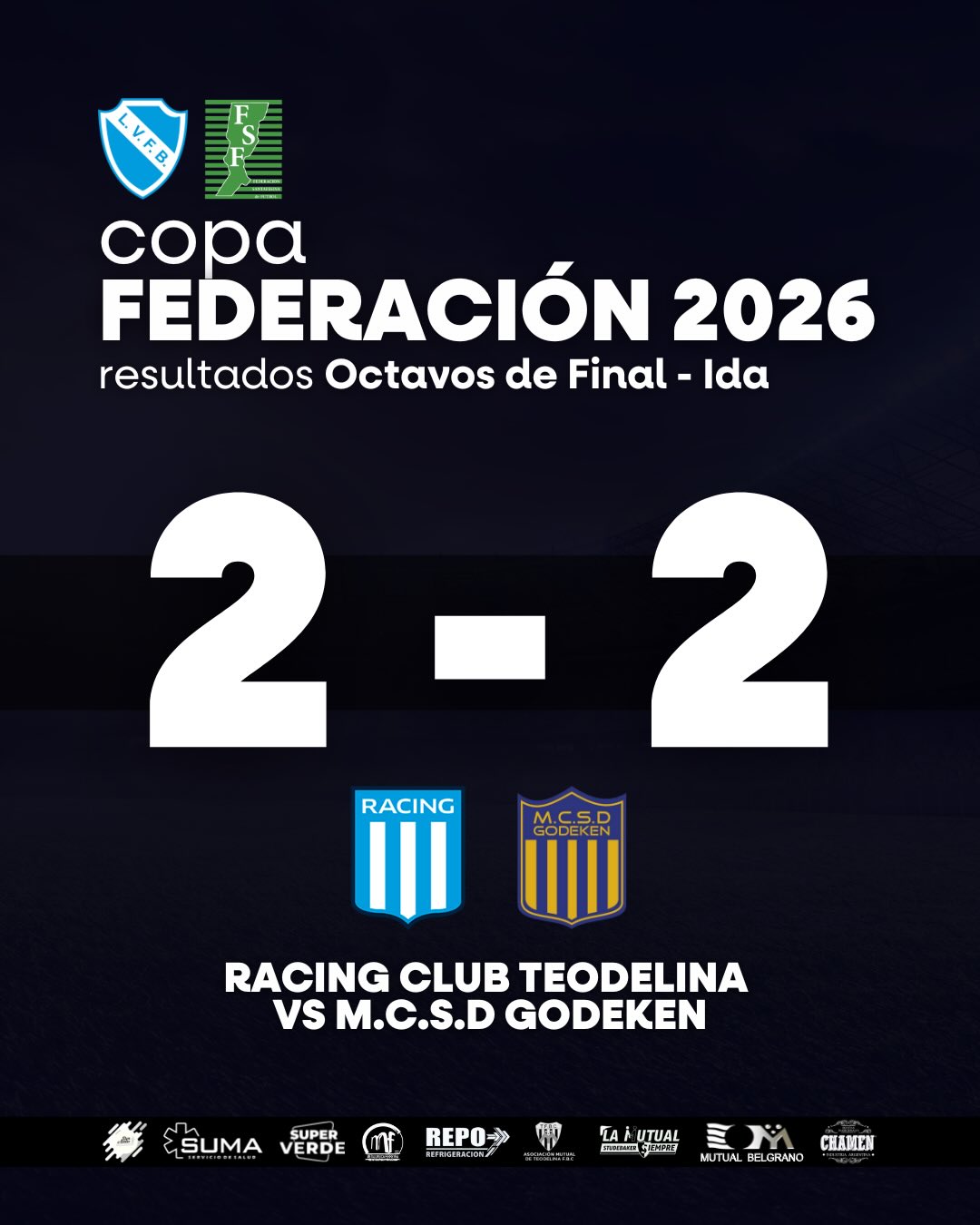 Artículos Copa Federación: Empate entre Racing y Godeken Escrito por Liga Venadense de Foot Ball 17 Febrero 2026 NOTICIAS DESTACADAS Por favor, vote Voto 1 Voto 2 Voto 3 Voto 4 Voto 5 Compartimos el resultado del partido de ida por los Octavos de Final de la Copa Federación Masculina. Anterior Siguiente